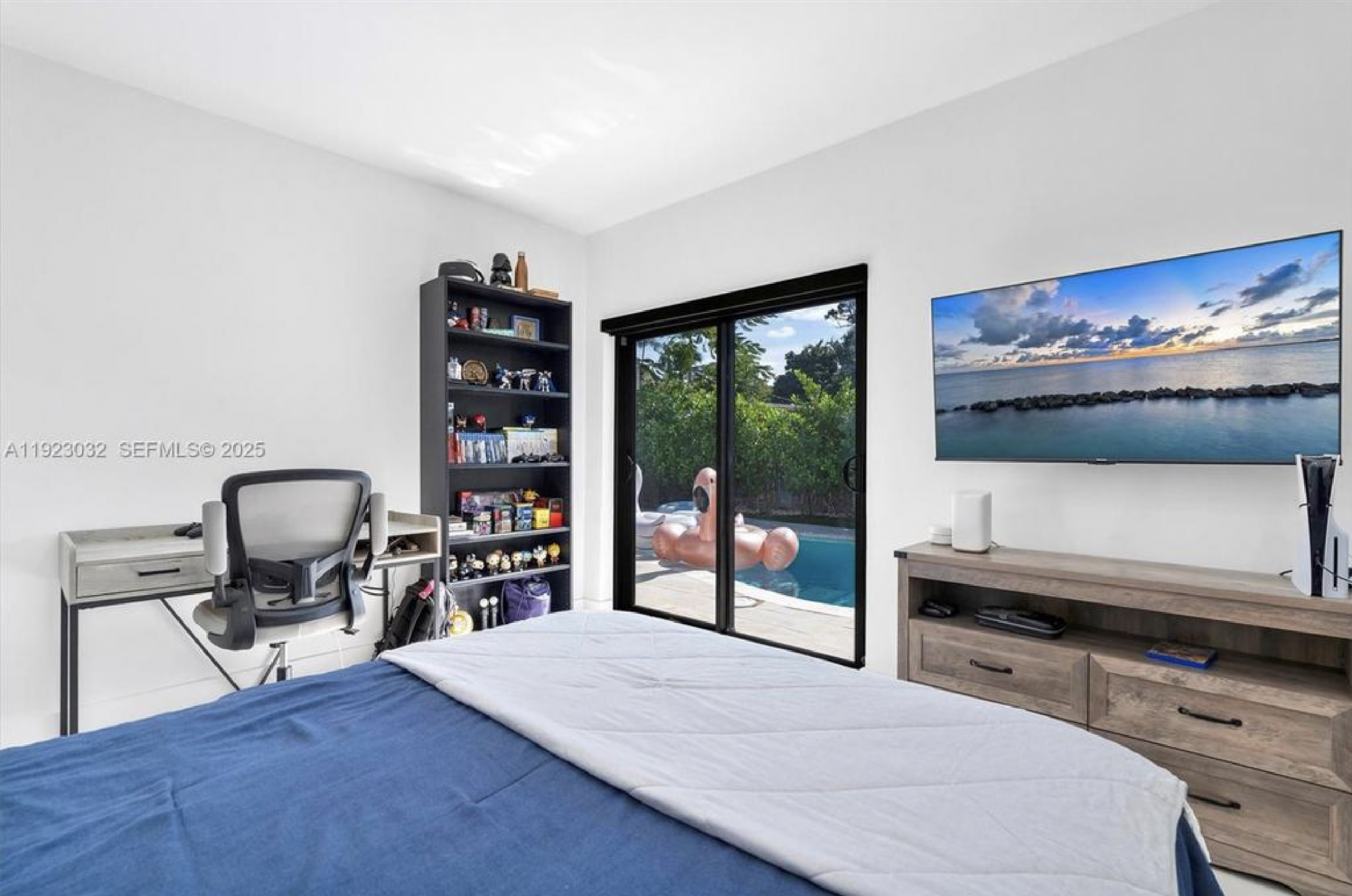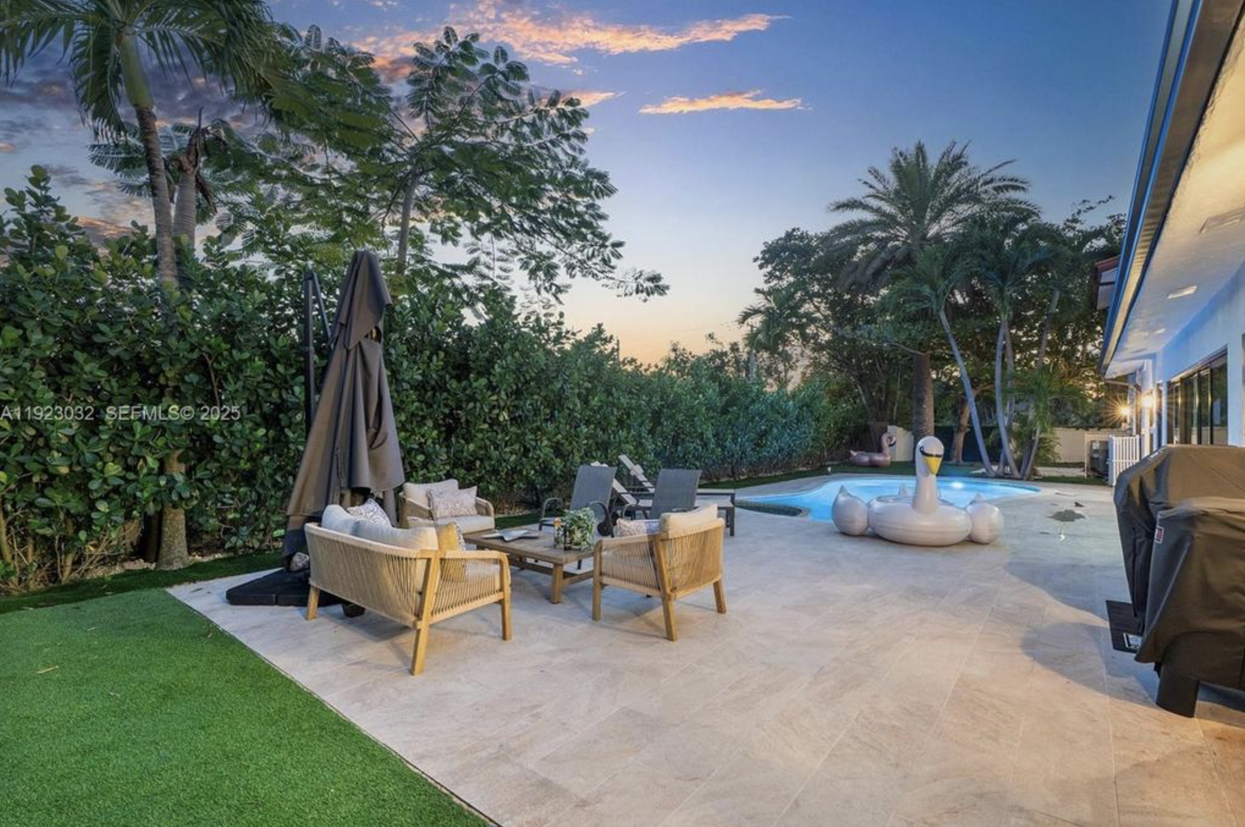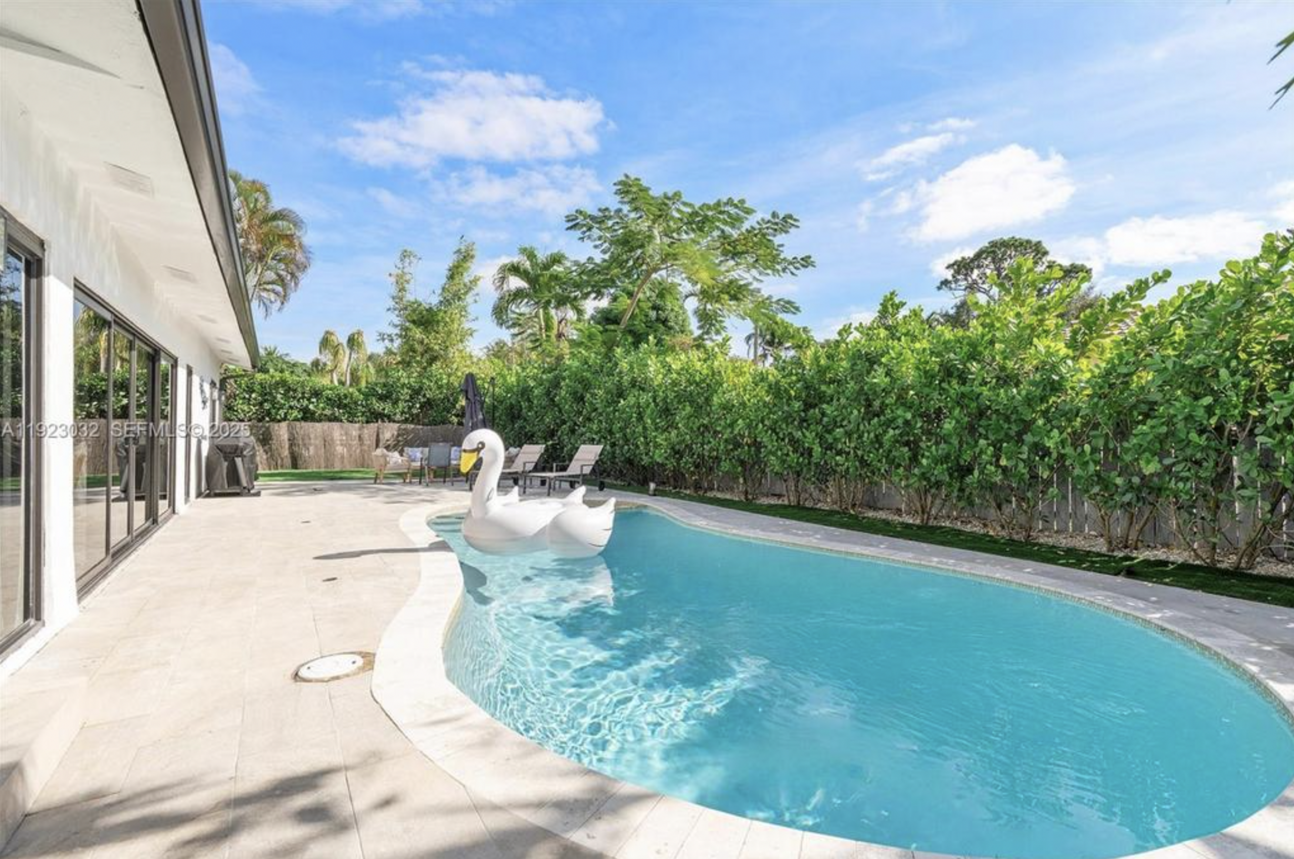 The contemporary kitchen comes equipped with modern appliances, including a dishwasher, and the home also features in-home laundry and a two-car garage. Outdoors, enjoy a private below-ground pool and ample yard space perfect for entertaining or relaxing.